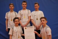 Am Nachmittag fand der Landesentscheid im Wettkampf IV statt, Jungen-Mädchen, Grundschulen und weiterführende Schulen. Bad Bergzabern hatte den Regionalentscheid für sich verbuchen können, aber denkbar knapp gegen Grünstadt, die im letzten Jahr nach Berlin gefahren waren und dort den fünften Platz belegt hatten. Der Wettkampf besteht aus zwei reinen Gerätebahnen, einer Gerätebahn im Synchronturnen und einem Bereich Sonderprüfung mit Stangenklettern, Weitsprung und Staffellauf. Bei der ersten Gerätebahn unterlag das Alfred-Grosser-Gymnasium den Grünstadtern um 0,1 Punkte., ein Wimpernschlag! Damit ging die Gerätebahn an Grünstadt. Die Gerätebahn B ging an Grünstadt, die Bahn C an Bad Bergzabern, die Sonderprüfung wieder an Grünstadt. . Damit hatten die Kurstädter ein Platzzifferminus von 2 Punkten. Beim Gewinn der Bahn A hätte man das gleiche Ergebnis gehabt wie im Regionalentscheid in Bad Bergzabern. So war das Glück den Grünstädtern mehr zugeneigt als den Vertretern von Bad Bergzabern(Nikita Gebel, Marco Deisner, Oskar Dietz, Marie Schnörringer und André Meyer). Und eine Silbermedaille , d.h. Vize-Landesmeister in Rheinland-Pfalz, ist ja auch nicht zu verachten, und die Hoffnung auf das kommende Jahr, wenn auch sicher infolge der Jahrgänge die Mannschaften wieder anders aussehen werden.
