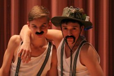 Schnauzbart, im Stile von Turnern bei Turnvater Jahn. Kurze Slapsticks am